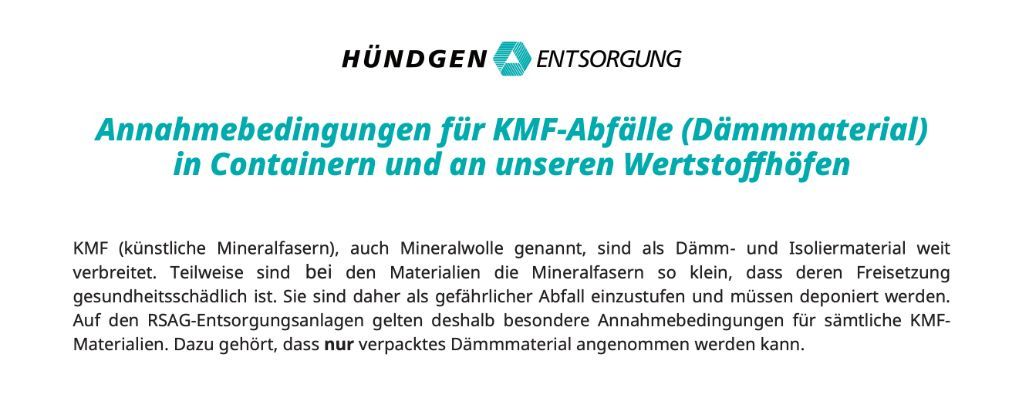 Für die Entsorgung von KMF-Abfällen (Dämmmaterialien) gelten besondere Annahmebedingungen. Lesen Sie hier nach worauf es zu achten gilt.