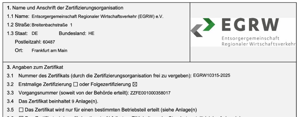 Zertifikat zum Entsorgungsfachbtrieb gemäß § 56 des KrWG – gültig bis 10.11.2026